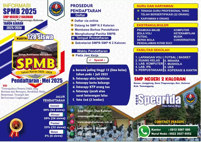 SPMB SMP N 2 KALORAN TAHUN 2025/2026 admin 14 Jun 2025 Telah dibaca : 35 kali Bagikan ke : Facebook Twitter WhatsApp LinkedIn